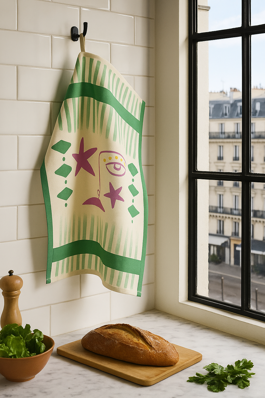 Offrez-vous un linge de cuisine aussi pratique qu’artistique avec notre torchon en coton, entièrement fabriqué en France. Leur design met en avant un visage abstrait peint à la main, apportant une touche d’originalité et d’élégance à toute cuisine. Déclinés en trois coloris raffinés – bleu, kaki et vert.